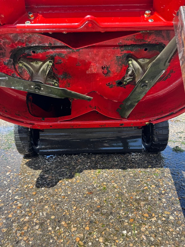 With the blades removed and the deck fully exposed, we hand scrape the accumulated grass out of the deck interior, then hit it with a pressure washer until it’s genuinely clean. This step matters more than most people realize, and here’s the best way to think about it.
