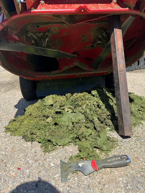 A mower deck works partly like a vacuum. As the blade spins at high speed, it creates airflow that lifts the grass upright before the blade cuts it — which is what allows for a clean, even cut — and then moves the clippings up through the chute and into the collector. That airflow depends on the deck interior being clear. When dried grass accumulates and cakes onto the deck walls and ceiling, it restricts that airflow. Less airflow means the grass doesn’t lift as cleanly before it’s cut, the clippings don’t move through the chute as efficiently, and more ends up left behind on the lawn in clumps rather than collected or mulched properly.